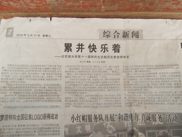 支教的生活是艰难的,宿舍里最常来的“不速之客”是老鼠,李波的支教日记《共青战鼠记》幽默中透着无奈;支教的生活是困苦的,支教老师没有工资,生活补贴很有限,学校没有食堂,吃不起饭店,又不会什么厨艺,每天的固定“大餐”面条让李波也快变成了“面条”。班主任是最辛苦的“主任”,每天下班,李波还要抱着厚厚的作业贪黑批改。累,真的很累!可是李波说他是“快乐的累着,累也快乐着”。上学期期末考试,六班同学的语文成绩大幅度提高,再也不是年级的尾巴了。一个学生写小纸条告诉李波:“语文能考六七十分,我可真高兴,爸爸妈妈也要奖励我呢!要知道,小学前三年,我的语文成绩可从来没及格……”不仅如此,在西湖小学包揽的全共青城4个作文得奖学生里,也有李波亲自指导的学生;搭班的数学老师告诉他,学生能自觉进教室早读了;隔壁班老师在监考后告诉他,这个班的纪律有了天翻地覆的改变——学生们对他的喜欢溢于言表,新年的时候,孩子们自己动手做了别致的小贺卡,画上了一颗颗小小的红心;家长更是珍惜他,得知他是一位支教老师,服务一年后就得离开,都纷纷请他留下来,甚至想到要给他在共青城介绍女朋友以便“拴住”这样的好老师。