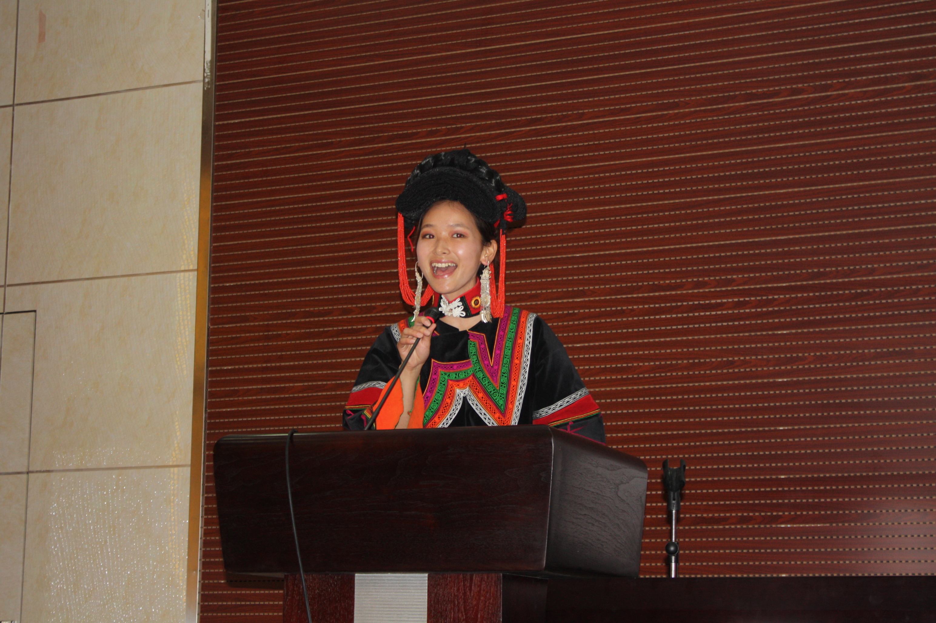 身着彝族服饰登场的苏琳同学无疑是本场比赛的焦点,浅浅迷人的微笑再加上五彩缤纷的民族服装使得每位评委及观众都为她深深陶醉。如果你认为她仅仅有这些,那你就错了,她演讲的是《凉山教育:知识浇灌之花竞放》,视角独特观点鲜明,细致入微以小见大,并辅之以其温和却不失激情的演说,沉郁顿挫恰到好处,令人刮目。演说完毕她又给我们秀了一段独具彝族特色的《敬酒歌》,激情滂湃高潮迭起,连一向沉着冷静的评委也忍不住击节叫好啧啧称赞,毫无疑问,苏琳已经深深感染了在座的每一个人,把他们带进了自己的世界。