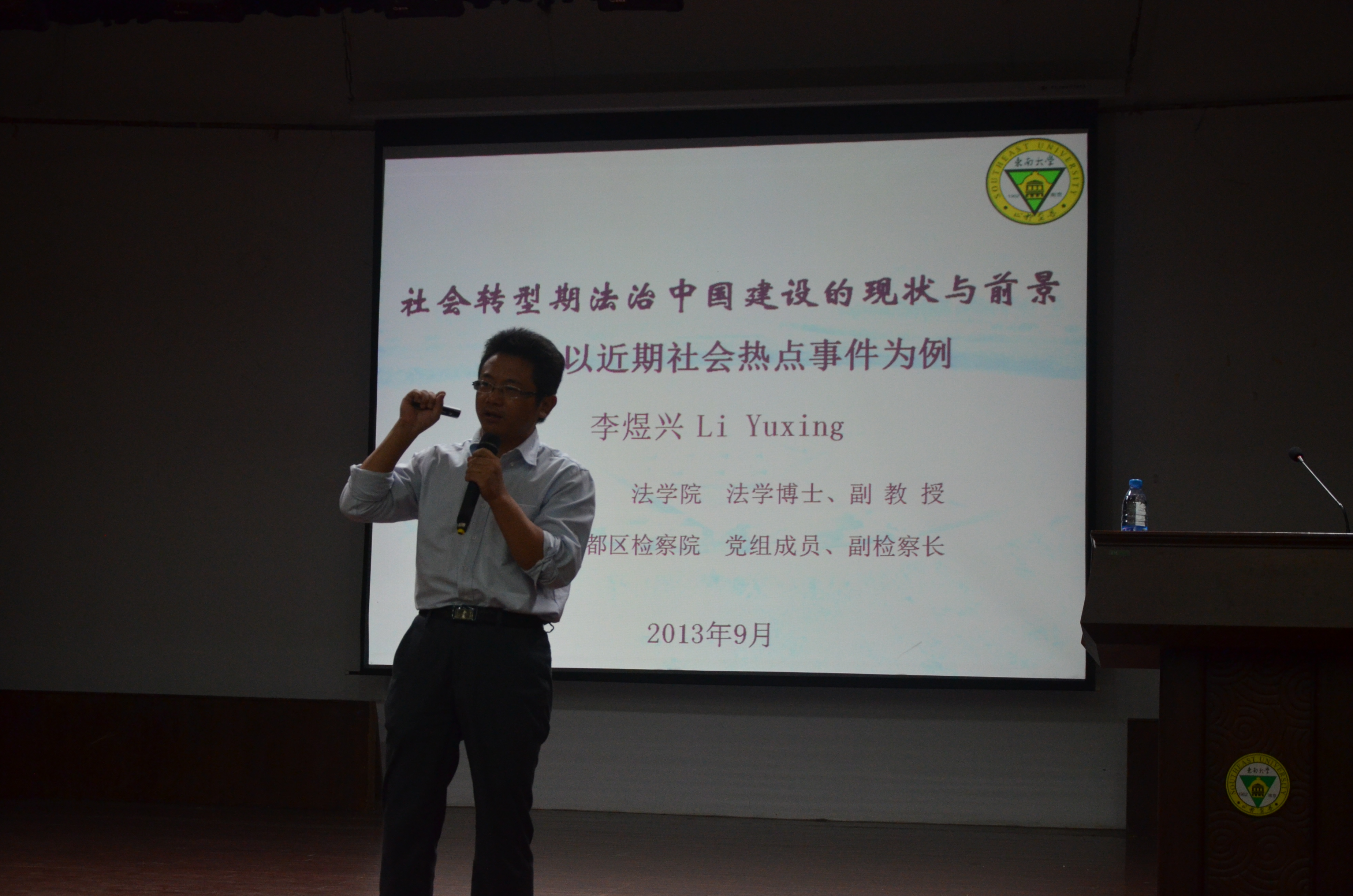 2013年9月26日晚19点至22点,366net必赢官网李煜兴副教授在丁家桥校区科技会堂,为丁家桥校区的医科学研究生作了题为《社会转型期法治中国建设的现状与前景——以近期社会热点事件为例》的学术讲座。讲座由中共366net必赢官网党委研究生工作部、366net必赢官网研究生院主办,366net必赢官网研究生会丁家桥分会承办,366net必赢官网研究生会协办。本场讲座作为对社会转型背景下如何建设法治中国的深入探讨、作为366net必赢官网2013年研究生人文与科学素养系列讲座的法律类首场、作为366net必赢官网新一届研究生会成立以来的首次走出九龙湖,李老师的讲座显得意义非凡。