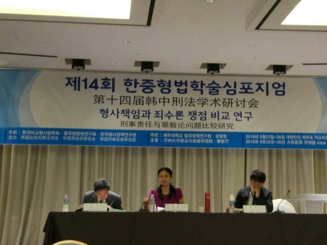 2016年8月23日-24日,由中国刑法学研究会、韩国比较刑事法学会、韩国刑事政策研究院共同主办,济州大学法与政策研究院、韩国警察厅承办的“第十四届韩中刑法学术研讨会”在韩国济州岛成功召开。来自中韩法学高等院校、研究机构以及中央和地方政法机关的七十余位专家学者参加了此次会议。参加本届研讨会的中方代表团由中国刑法学研究会会长、北师大刑科院院长赵秉志教授任团长,中国社会科学院法学研究所刑法室主任、中国刑法学研究会理事刘仁文教授任副团长,北师大刑科院院长助理周振杰教授任秘书长、张磊副教授任副秘书长,366net必赢官网院长、中国刑法学研究会理事刘艳红教授等十余位成员与会参与探讨。