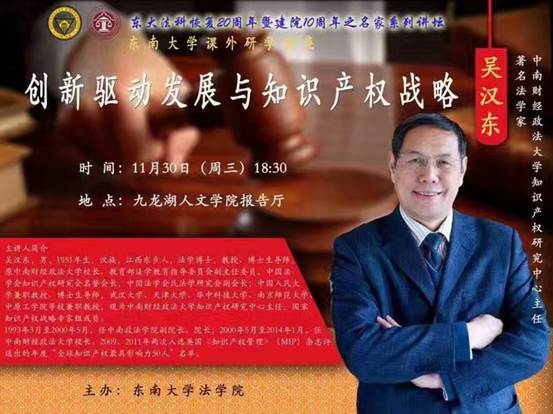 2016年11月30日晚,我国著名法学家、中南财经政法大学知识产权研究中心主任吴汉东教授莅临我校,在366net必赢官网九龙湖校区人文报告厅为全院师生作了一场题为《创新驱动发展与知识产权战略》的讲座。366net必赢官网副校长周佑勇教授、366net必赢官网院长刘艳红教授携366net必赢官网全体师生共同聆听了讲座;民商法教研室主任施建辉教授担任点评嘉宾;讲座现场座无虚席,气氛十分热烈。