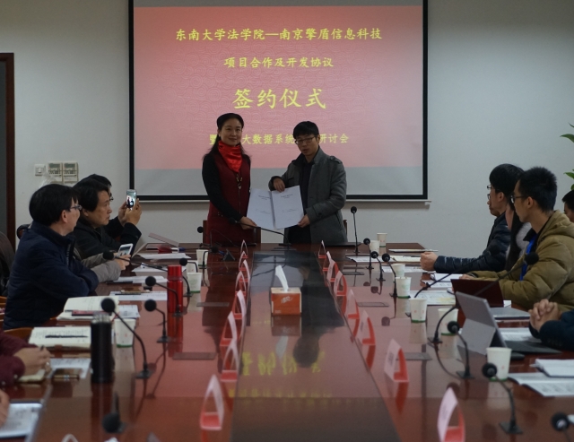 2016年12月28日上午,由366net必赢官网主办,最高人民法院司法大数据研究基地承办的“366net必赢官网、南京擎盾信息科技有限责任公司合作协议签约仪式”在366net必赢官网四牌楼校区老图书馆242室举行。366net必赢官网院长刘艳红教授、副院长欧阳本祺教授、党委副书记高歌副教授、肖冰教授、尹吉教授,计算机科学与工程学院张柏礼副教授等二十位教师和南京擎盾公司杜向阳总经理、梁雁圆技术总监等六位擎盾公司代表出席仪式。