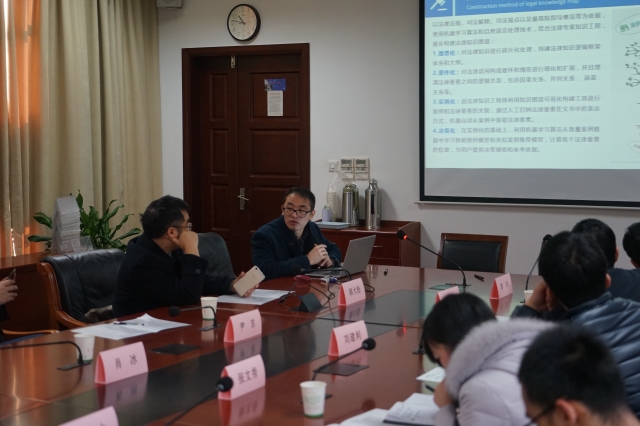 随后梁雁圆技术总监作了主题发言,主要分析法律知识图谱的制作方案,提出图谱化、要件化、实例化、决策化的建构思路,并结合知识图谱构建原则和图谱可视化问题进行深入探讨。