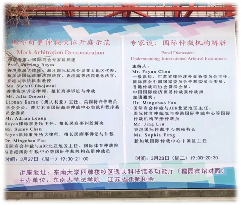 该单元课程不仅有内部授课,亦有两场开放式讲座,分别是27日晚的“国际商事仲裁模拟开庭示范”和28日晚的“专家谈:国际仲裁机构解析”。