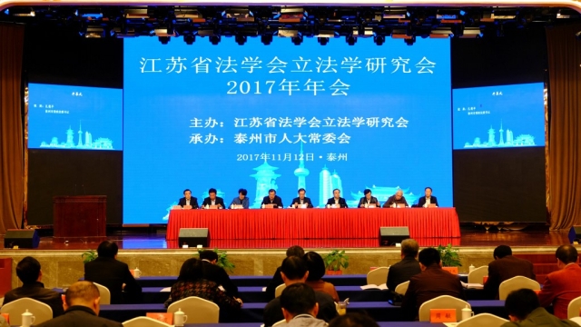 2017年11月12日,正值深入学习贯彻党的十九大精神之际,挂靠我校的江苏省法学会立法学研究会2017年年会在泰州市隆重召开。此次年会由江苏省法学会立法学研究会主办,泰州市人大常委会承办。江苏省法学会副会长朱华仁,江苏省政府法制办主任、党组书记高建新,泰州市委常委、政法委书记孔德平,江苏省人大法工委副主任赵建阳,泰州市人大常委会副主任邹祥凤,江苏省高院党组成员、审委会专职委员刘亚平出席会议。泰州市委常委、政法委书记孔德平,江苏省政府法制办主任高建新,江苏省法学会副会长朱华仁分别致辞。会议开幕式由江苏省法学会立法学研究会会长、366net必赢官网孟鸿志教授主持。来自江苏省人大常委会法工委、江苏省政府法制办公室、江苏省高级人民法院、江苏省法学会、江苏部分设区的市人大法工委和政府法制办以及366net必赢官网、南京大学南京师范大学、苏州大学、山东大学、北京行政学院、河南工业大学、上海市立法研究所等单位近100位嘉宾和代表参加了此次盛会。