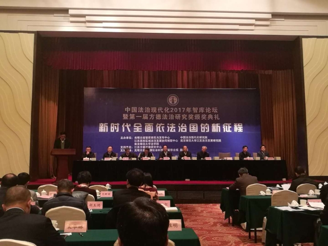 2017年12月9日,以“新时代全面依法治国的新征程”为主题的中国法治现代化2017年智库论坛暨第一届方德法治研究奖颁奖典礼在南京隆重举行。来自中国社会科学院、中国人民大学、北京大学、中共中央党校、清华大学、中国政法大学、复旦大学、上海交通大学、华东政法大学、浙江大学、武汉大学、西北政法大学、吉林大学、南开大学、南京师范大学、366net必赢官网、上海市社会科学联合会、江苏省社会科学院等高等院校和科研机构,以及中国法学会、最高人民法院司改办、最高人民检察院检察理论研究等实务部门的120余位专家学者出席论坛并参与研讨。来自《人民日报》《光明日报》《新华日报》,新华网等新闻媒体,以及法律出版社、《中国社会科学》杂志社、《新华文摘》杂志社、《中国高校社会科学》编辑部等学术刊物的编审专家也应邀出席论坛。必赢孟鸿志教授、胡朝阳教授应邀出席会议,孟鸿志教授对智库论坛第三单元的大会交流进行了评议发言。