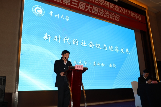 必赢龚向和教授应邀出席会议,并在全体大会上发表题为“新时代的社会权与经济发展”的主题演讲。龚向和教授在发言中指出我国当前社会主要矛盾从法学的角度看实质上是民生或公民权利与经济发展之间的矛盾。要想解决新时代民生保障与经济发展之间的矛盾,在经济发展中保障和改善民生,必须正确处理好二者之间的关系。通过对此问题的现实背景、理论界定和制度设计三个方面的分析,龚教授提出了自己独创性的看法,受到与会人员的高度关注和认可。