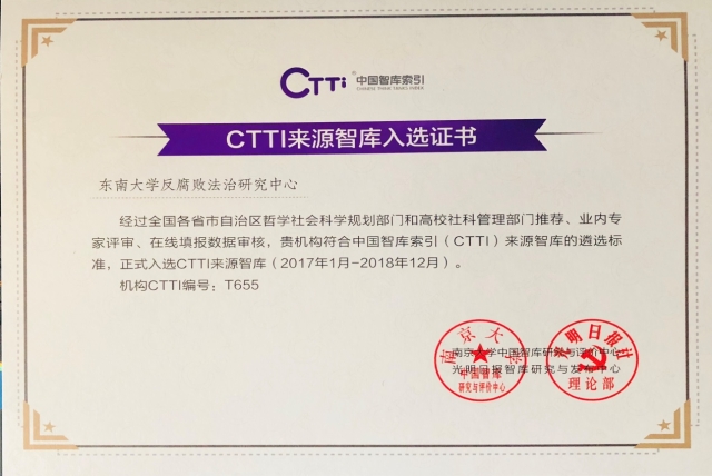 2017年12月20日,由南京大学和光明日报联合主办的“中国智库治理暨思想理论传播高峰论坛”在北京召开。会议隆重发布了CTTI最新增补来源智库名录,必赢“反腐败法治研究中心”成功入选CTTI来源智库(2017年1月—2018年12月)。