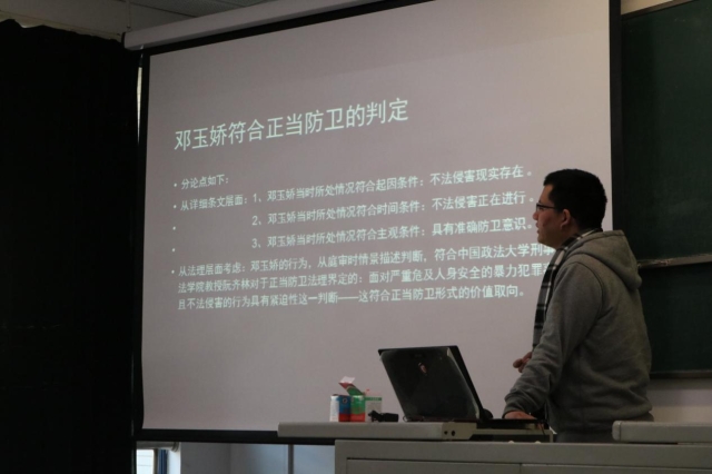 5班研讨课以“邓玉娇、于欢的行为是正当防卫还是防卫过当”为题,由366net必赢官网陈洪兵教授主持,陈洪兵教授给出的于欢案和邓玉娇案这两个热点案例为切入点,进一步探索正当防卫的成立条件,成立时间以及正当防卫在当今时代遇到的困境以及出路。为了进一步激发同学们的热情,本次研讨课采取控辩对抗的形式进行。针对陈洪兵教授提出的问题,同学们分成四组,首先由每组以PPT的形式展示各自的观点;其次是自由发言阶段,在这个阶段同学们对这些问题踊跃发言,都能给出专业理性新颖的看法;在主持人点评环节,陈洪兵教授对本次研讨的主题进行了更为细致的讲解,对本次研讨课也给予了幽默诙谐但又专业精彩的点评。陈洪兵教授表示,法学的学习主要是方法的学习和解释的学习,只有掌握了正确的法学研究方法和正确的法学解释方法,才能在各种纷繁复杂的案件中抽丝剥茧,牢牢的抓住问题的本质,进而才能解决问题。