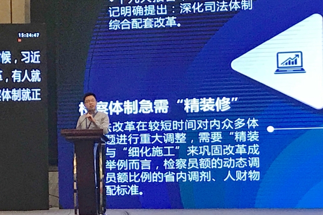 除此之外,王禄生副教授以司法体制改革中员额制与人员分类管理为切入点,介绍了三个方面的内容:第一点是检察员额制与人员分类管理改革的配套需求,即将“检察员额统筹管理”、“检察员额动态调整”、“员额检察官遴选”、“员额检察官退出机制”互相统筹,综合配套,以对检察人员工作质效的实时、动态、精准评估,建立一套跨地域、扩层级、跨部门、跨岗位的科学评估体系。第二点是检察员额制与人员分类管理改革配套需求的技术解决方案,即基于自然语义识别和人工智能技术,开发一套案件权重的大数据测算系统,该系统应具备三个要素:(1)它需要立足于所有数据,做到全样本覆盖。(2)应将实体数据与程序数据相结合。(3)立足于员额动态调整、省级人财物精准分配、检察官责任制,推行综合配套改革。第三点是检察员额制与人员分类管理改革的配套需求:(1)还权一线检察官。(2)优化检察权运行机制。(3)放权不放任、监管不缺位。