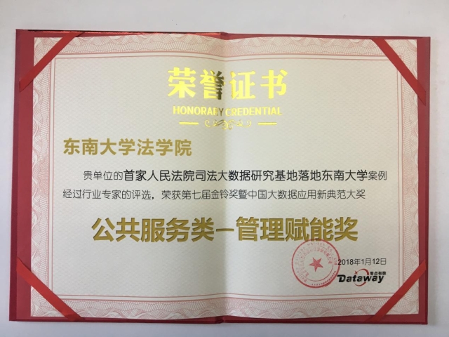 人民法院司法大数据研究基地于2016年7月获批成立,是最高人民法院在全国范围内设立的第一家、也是目前唯一的“人民法院司法大数据研究基地”。2016年11月基地正式入选“中国智库索引”(CTTI)。基地围绕自然语义识别、知识图谱、机器学习等与司法大数据直接相关的核心技术积累了一批知识产权;联合开发的同案不同判预警平台、案件权重智能测算平台、法律问答智能机器人等3套产品已投入使用。其中,智能问答机器人(在线版)已部署了704家机构、智能问答机器人(实体版)已部署了104家机构。此外,基地成员还主持了包括国家社科重大项目《大数据和审判体系与审判能力现代化研究》在内的多项国家级、省部级课题;采用司法大数据的研究范式形成的系列大数据决策咨询报告荣获首届最高人民法院司法大数据研究报告一等奖。本次基地获评第七届金铃奖标志着必赢在司法大数据研究平台建设方面取得新的突破。