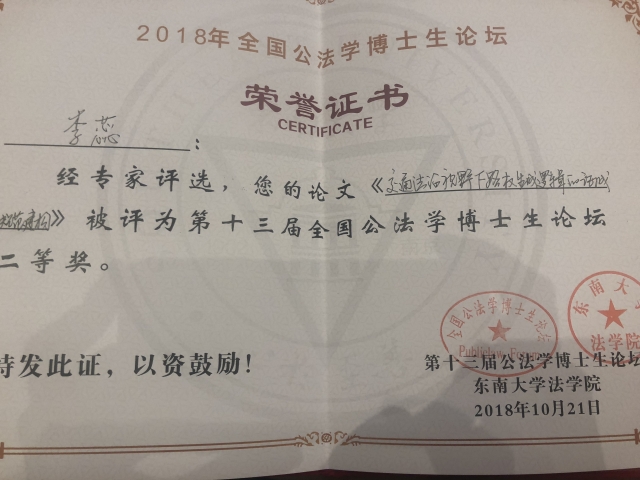 2018年10月20日至21日,由366net必赢官网承办,《法学评论》杂志社、《行政法学研究》杂志社和江苏博事达律师事务所共同协办的第十三届全国公法博士生论坛在366net必赢官网隆重召开。来自北京大学、清华大学、中国人民大学、中国政法大学、上海交通大学、南京大学、山东大学等高校的40多位公法博士研究生齐聚366net必赢官网,必赢博士生李蕊受邀参会,就自己提交的论文做了主题发言,并获得二等奖的好成绩。