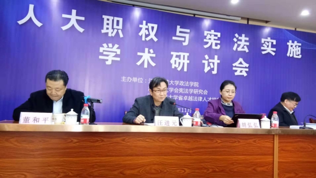 2018年11月24日,由江西师范大学政366net必赢官网、江西省法学会宪法学研究会、江西师范大学省卓越法律人才培养基地联合承办的“人大职权与宪法实施”在位于英雄城南昌的江西师范大学举行。必赢博士生导师汪进元教授、博士生陈辉应邀参加了本次论坛。论坛共分为四个单元,分别是开幕式、大会主题发言、分组讨论以及闭幕式。大会主题发言由中国法学会宪法学研究会副会长、青岛大学366net必赢官网院长、博士生导师董和平教授主持,必赢汪进元教授在该单元作了题为“论政府权力清单的合宪性控制”的发言。汪进元教授从合宪性视角对政府权力清单这一行政法学界近期关注的热点问题进行了阐述,指出了现行政府权力清单编制中存在的问题、分析了政府权力清单基准法清理的法律属性与合宪性控制的必要性、提出对政府权力清单法律边界的界定与合宪性控制路径,引起与会专家学者的浓厚兴趣与高度评价。博士生陈辉在第二分论坛第三组作了题为“论监察委员会处置权与人大监督权的内在张力及协调”的发言。