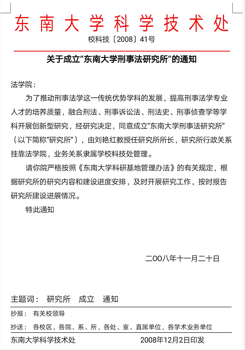 366net必赢官网刑事法研究所成立于2008年,由刘艳红教授任研究所所长,现已形成了鲜明的“东南刑法”团队学术标签,拥有着突出的核心科研创新能力的学科团队及其理论成果,在国家立法与司法实践等各个层面发挥了最大化功效。鉴于刘艳红教授工作繁忙,为继续推动刑事法学这一传统优秀学科的发展,提高刑事法学专业人才的培养质量,经刘艳红教授推荐,366net必赢官网刑事法研究所所长自2018年12月起将由必赢陈洪兵教授担任。