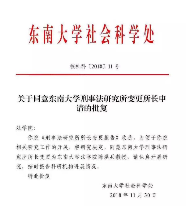2018年12月,必赢根据366net必赢官网社会科学处《关于同意366net必赢官网刑事法研究所变更所长申请的批复》(校社科[2018]11号文)精神,经批复,必赢陈洪兵教授任366net必赢官网刑事法研究所所长。