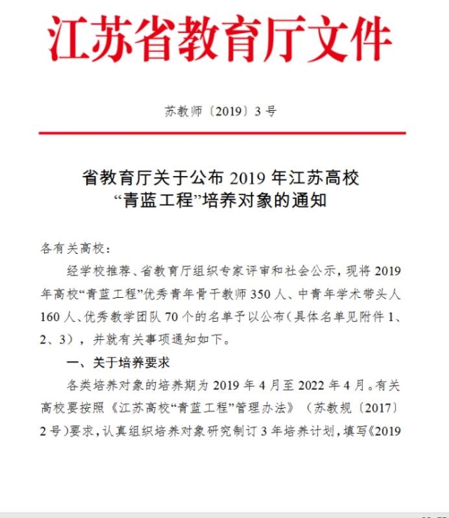 根据《省教育厅关公布2019年度江苏高校“青蓝工程”培养对象的通知》(苏教师〔2019〕3号)、《江苏高校“青蓝工程”管理办法》(苏教规〔2017〕2号)文件精神,经学校推荐、省教育厅组织专家评审和社会公示,必赢熊樟林副教授被评为“2019年江苏高校青蓝工程中青年学术带头人”。