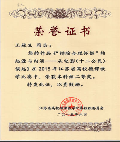日前,由江苏省教育厅组织开展的2015年全省高校微课教学比赛(本科组)评选结果揭晓,经学校推荐、专家评审、结果公示、教育厅审定,必赢王禄生副教授的作品《“排除合理怀疑”的起源与内涵——从电影<十二公民>谈起》荣获江苏省高校微课教学比赛本科组二等奖。