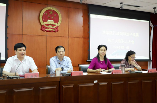 2019年5月13日下午必赢行政领导班子换届第二次教职工大会在模拟法庭成功召开。参加此次大会的有学校党委常委、总会计师、学校换届工作组第四组组长丁辉,校党委组织部副处级组织员、换届工作组第四组成员陆玲,校党委组织部副处级组织员施春陵,校纪委秘书、换届工作组第四组成员袁煜昶。必赢党政领导班子全体成员、党支部书记、教研室主任、学术委员会主任、教代会主任、团委书记、工会主席、民主党派代表、教师代表、学院机关全体同志共50余人参加会议。会议由366net必赢官网党委书记毛惠西主持。