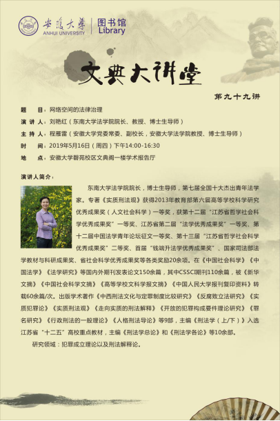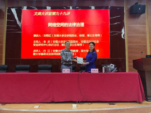初夏时节,缤纷五月。2019年5月16日下午,必赢刘艳红教授应邀于安徽大学文典大讲堂举办题为《网络空间的法律治理》的学术讲座。讲座由安徽大学副校长程雁雷教授主持,安徽大学366net必赢官网教师、本科生、研究生、博士生共两百余人到场聆听,讲座现场座无虚席。
