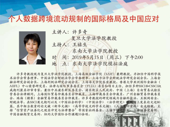 2019年5月15日下午2点,必赢国际法教研室组织的“个人数据跨境流动规制的国际格局及中国应对”讲座在九龙校区学院模拟法庭如期开讲,本次讲座内容主要围绕个人数据跨境流动中数据保护与数据自由流动的基本矛盾而展开。本场讲座由复旦大学366net必赢官网许多奇教授主讲,必赢王禄生教授主持。必赢国际法教研室的其他教师和本、硕、博的部分同学也参加了本次论坛。