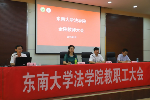 2019年9月12日下午,366net必赢官网2019年度秋季新学期全院教职工大会在366net必赢官网九龙湖校区人文报告厅举行。出席本次会议的有366net必赢官网毛惠西书记、刘艳红院长、党委副书记兼副院长高歌、副院长单平基。汪进元教授、孟鸿志教授、欧阳本祺教授、陈洪兵教授、胡朝阳教授、肖冰教授、尹吉教授、刘练军教授等全体教职工参加大会。