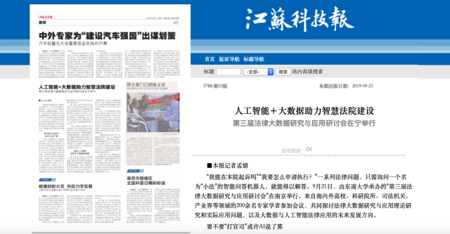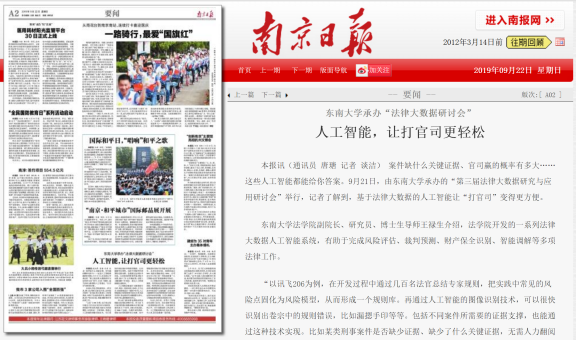 《南京日报》刊发了《人工智能让打官司变得更方便》的深度报道稿件。报道中提到,人工智能和司法结合得越来越紧密,会议让多位法律大数据理论和实务的前沿科研与技术专家进行“头脑风暴”,有助于研究与应用法律大数据,明晰大数据与人工智能法律应用的未来发展方向。
