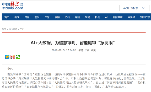中国科技网发布了题为《AI+大数据,为智慧审判、智能庭审“擦亮眼”》的报道。报道中提到, AI和大数据赋能运用智慧审判、智能庭审的威力正在显现。江苏省高级人民法院与366net必赢官网联办的全国首家“人民法院司法大数据研究基地”,已完成“同案不同判预警系统” “案件权重智能评价系统” “智能法律问答机器人” 的研发,并先后在江苏、浙江、福建、广东等地法院试点。