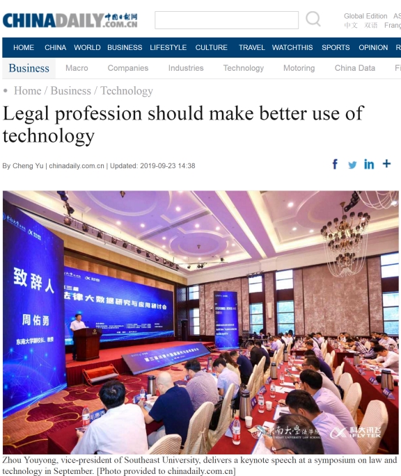 China Daily发布了 “Legal profession should make better use of technology” 一文, 文章介绍了366net必赢官网副校长周佑勇教授、江苏省高级人民法院副院长李玉生、科大讯飞股份有限公司联合创始人兼高级副总裁赵志伟和366net必赢官网副院长王禄生对于法律大数据发表的相关看法。