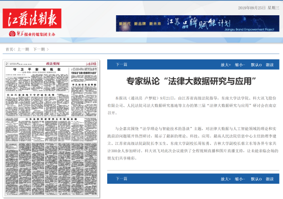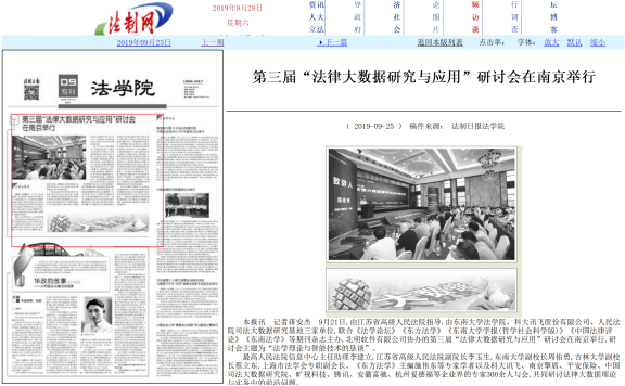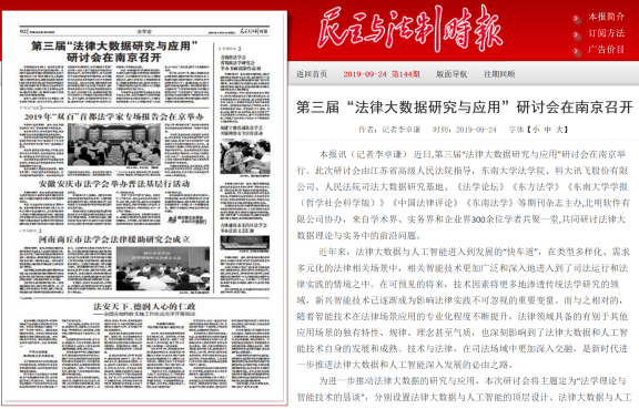 《民主与法制时报》刊登了题为《第三届“法律大数据研究与应用”研讨会在南京召开》的报道。报道中提到, 近年来,法律大数据与人工智能进入到发展的“快车道”,在类型多样化、需求多元化的法律相关场景中,相关智能技术更加广泛和深入地进入到了司法运行和法律实践的情境之中。技术与法律,在司法场域中更加深入交融,是新时代进一步推进法律大数据和人工智能深入发展的必由之路。