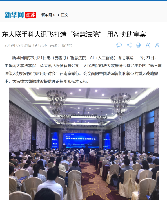新华网发布了题为《东大联手科大讯飞打造“智慧法院” 用AI协助审案》的报道。报道认为,本次会议顺应中国法院智能化转型的发展,为法律大数据建设提供理论指引和技术支持。尤其是人工智能在案件审判过程中的运用,不仅能够提升判案的精确性,也能大大减少法官的工作量。