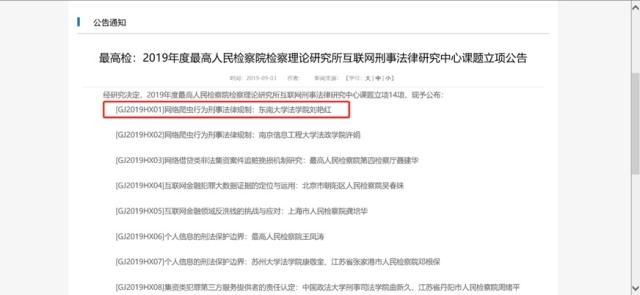 2019年5月28日,最高人民检察院发布关于申报2019年度最高人民检察院检察理论研究所互联网刑事法律研究中心课题的公告,此次课题面向全国检察系统内外实务和理论专家。 2019年7月26日,最高人民检察院理论研究所公告——2019年度最高人民检察院检察理论研究所互联网刑事法律研究中心课题立项14项,必赢刘艳红教授所申请的《关于网络爬虫行为刑事法律规制》课题荣获立项。