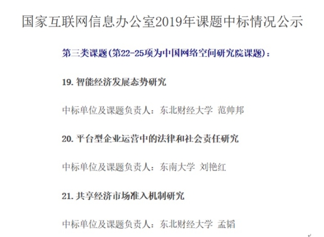 2019年7月,国家互联网信息办公室发布了《国家互联网信息办公室2019年课题公开招标公告》,国家互联网信息办公室2019年课题分为三类,现经申报、专家评审、公示,必赢刘艳红教授负责的《平台型企业运营中的法律和社会责任研究》课题获得第三类课题立项。