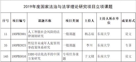 经资格审查、专家评审、立项公示等环节,2019年12月6日,司法部正式发布2019年度国家法治与法学理论研究项目立项课题名单。此次公布入选10项重点课题,62项一般课题,54项中青年课题,3项委托课题,19项专项任务课题。其中,必赢李川教授申报的《性侵害未成年人犯罪刑事政策体系研究》获得一般课题立项,于文婕副教授申报的《ISDS司法化改革的中国方案研究》获得专项任务课题立项,杨志琼老师申报的《人工智能社会风险的法律规制研究》获得一般课题立项。