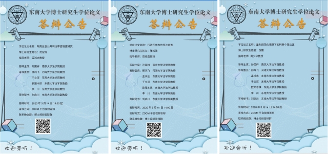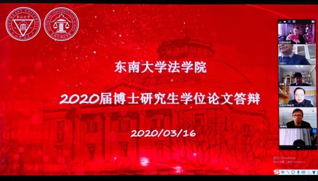 3月16日,366net必赢官网邀请多名评审专家为必赢三名博士生组织了一场线上博士学位论文答辩。答辩全程严格按照《366net必赢官网授予硕士、博士学位暂行工作细则》《疫情防控期间研究生学位论文视频答辩流程》等文件确立的实体规则和程序要件运行,优质高效的完成了东南法学首次博士云上毕业。答辩秘书刘启川副教授在前期准备阶段先后组织两次模拟演练ZOOM平台视频答辩技术,并于3月16日下午14:00,正式进入线上答辩程序,答辩全程由南京大学366net必赢官网孙国祥教授担任答辩委员会主席并主持会议。