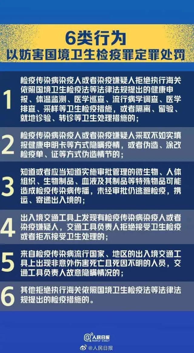 16日上午,最高人民法院、最高人民检察院、公安部、司法部、海关总署联合发布《关于进一步加强国境卫生检疫工作依法惩治妨害国境卫生检疫违法犯罪的意见》,提出六类可能定罪入刑的妨害国境卫生检疫行为。