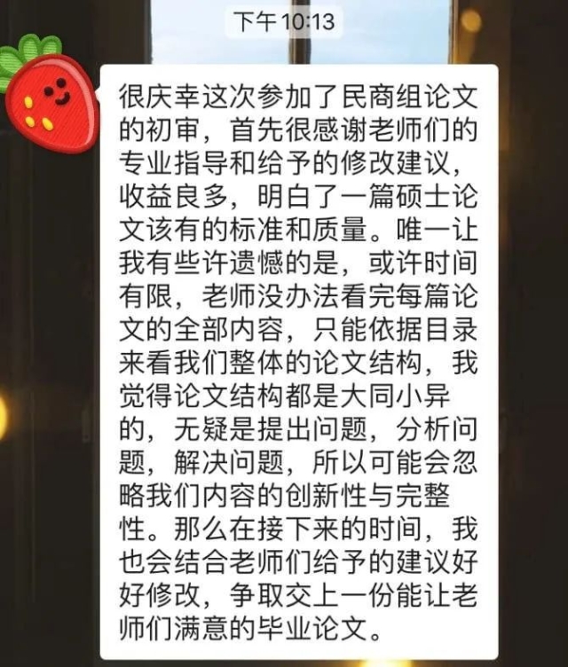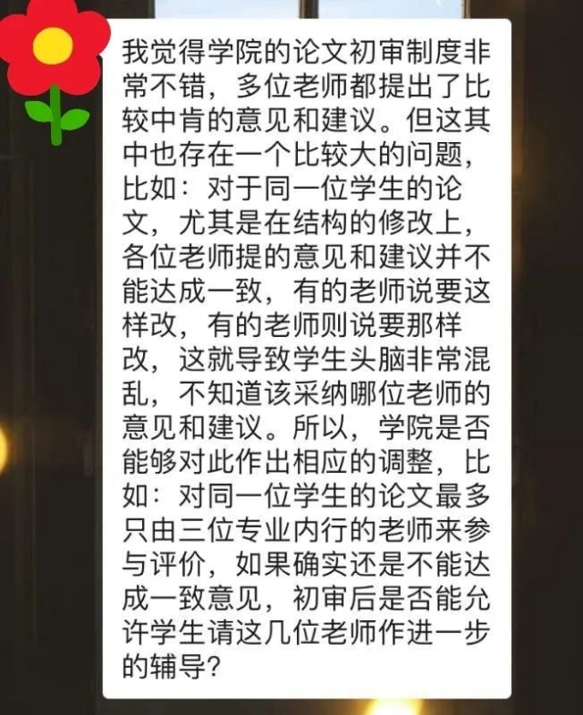二、希望开题环节严格把控,以及提前论文质量指导会召开的时间。在目前这个阶段大部分同学论文已经基本定型,但因为前期开题环节的“仁慈”导致在学院把关严格的情况下部分学生论文需要进行比较大的改动,时间和精力上有心有余而力不足之感。