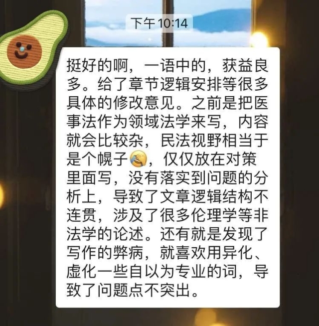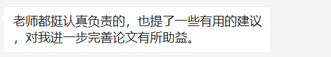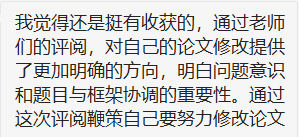 一、认为评审会对于自己论文的完善有很大帮助。指导小组的老师们点评到位、实用,很多修改意见不仅理清学生困惑,还指明了后期修改的方向;同时论文点评很严格,让学生后期需要在内容斟酌、框架打磨、格式细致等方面进行不断完善。