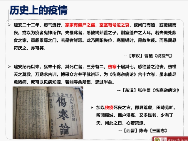 面对疫情,郑颖慧老师和苗泽一老师将理论与实践结合起来,通过引用历史文献中的“瘟疫”与中国法制史上应对“瘟疫”的措施,引导学生进行思考,探讨中华法系的历史逻辑,见证了中华民族的智慧。