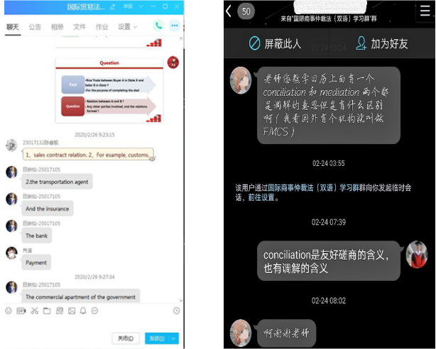 学院同时开设《国际公法》《国际私法》《国际贸易法》《国际商事仲裁法》《世界贸易组织与国际商事法律制度》,依托QQ群展开全英或双语教学,课前发布配套PPT,课上妙语解颐、循循善诱,并辅以课后习题、敦促温故而知新,授课幽默风趣而又切中肯綮,实现了线上线下同质等效的教学效果。