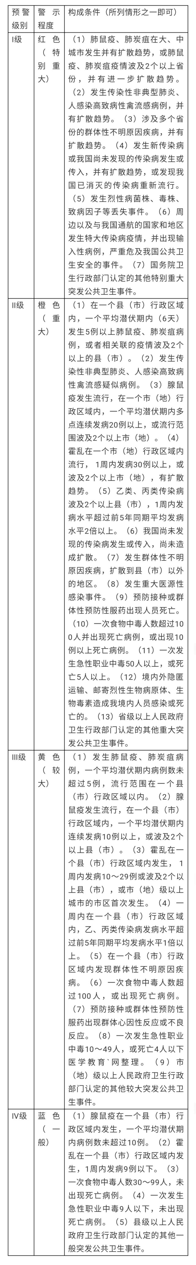 如前所述,预警分为一级、二级、三级和四级,其中一级为最高级别。而具体如何来定级,《突发公共卫生事件分级标准》做出了明确的规范。在此,笔者将分级标准用下表列举出来: