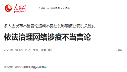 自新冠肺炎疫情爆发以来,网络不当言论就时有发生。2020年1月24日,河南郑州的张某因在微信群中发布“我刚从武汉回来,专门去染上病毒回来传染你们”等不当言论,被郑州市公安局柳林分局予以行政拘留10日的处罚。2月2日,深圳一男子因在网络上恶意辱骂湖北籍人士的言论,被深圳光明警方以涉寻衅滋事的违法行为处以治安处罚。