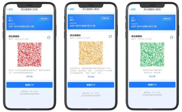 “健康码”是以真实数据为基础,对使用者健康状况做出评估的数字化证明。民众填写自己的体温、接触史和出行信息等内容后经后台审核,形成一个根据自身危险等级不同的带有颜色标识的二维码。在办公楼、商场、地铁、火车站等人流密集的地点扫码核验,一次申报后,全市通用,实现了高效率的人员流动管理,避免过多的人员接触和聚集。