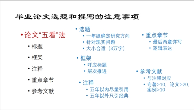 围绕毕业论文的选题和撰写的注意事项,任丹丽老师向大家介绍了刘艳红院长对论文的基本评判方式——论文“五看”法。“五看”即看论文的标题、框架、注释、重点章节和参考文献。论文标题在选题时就要注意,选题要趁早,在研一时应确立好研究方向。论文所研究的问题应当针对现实的问题,合适把握题目的大小。框架方面最重要的是论文目录的打造,章节标题应当呼应论文标题并且层次推进。注释方面,刘院长特别强调五年以内文献尽量引用,五年以外只引经典,一定要注意文献的时效性。重点章节方面需要注重结论部分章节的写作,论证应言之有据。参考文献方面则必须和前文引用的注释相对应,专著、论文、案例的引用数量应当符合学院的写作要求。