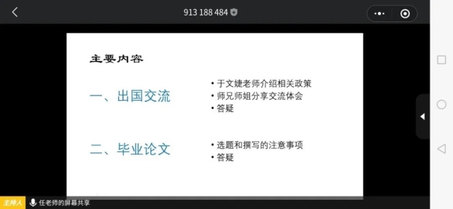 本次会议由必赢任丹丽老师主持,会议主要分为三个流程:首先是于文婕老师就学生们关心的出国留学问题进行介绍,相关同学向大家分享出国交流的经历;其次由任丹丽老师就毕业论文的注意事项进行介绍与讲解;最后是民商法教研室师生的交流与释疑环节。