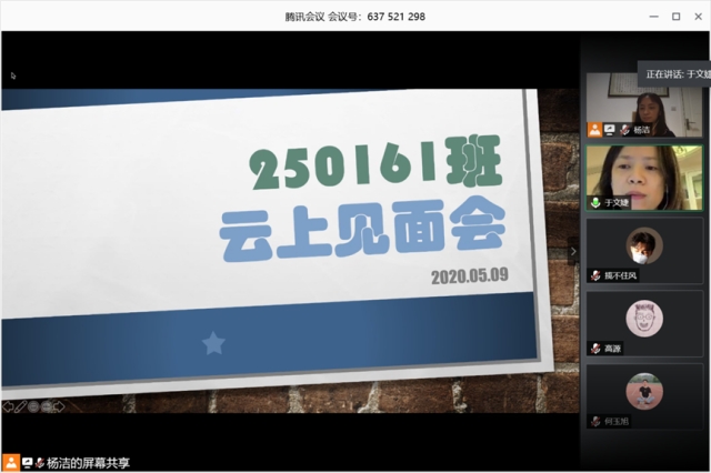 随后,250161毕业班的同学们在这场线上交流会中开展了丰富的活动,彼此之间也得到了进一步的交流和了解。会议中班主任杨洁老师设计了随机抽取同学的程序,首先抽取了部分同学,回忆了过去四个月疫情期间“最想见到谁”“最想吃什么”“难过什么”“无奈什么”等不同的话题,分享了疫情期间的喜怒哀乐。然后抽取另一部分同学乘坐时光机,以“第一次记住彼此的原因”为话题,回忆了初次见面时的情形以及对彼此的印象。