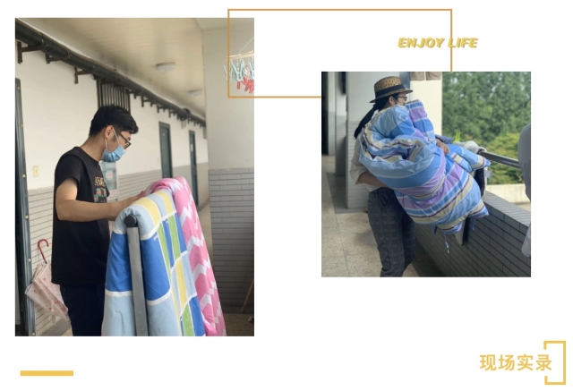 “5·20”天气晴朗,志愿晒被的366net必赢官网师生们根据不同的分组,早早聚集在了各个宿舍围合门口。早上8点,橘园组率先行动,随后梅园组和桃园组亦准备就绪。为避免被褥晒后放错,在晾晒之前,志愿者专门准备了标签,一一注明每套被褥的宿舍号、床铺号,并用夹子固定,确保被褥能正确归位。晾晒过程中,志愿者分工协作,配合默契,一趟又一趟地将同学们的床垫、被子、枕头等物品搬到阳台上、宿舍楼下晾晒区充分晾晒,汗水渐渐沾湿了衣襟,但他们的脸上却洋溢着温暖的笑容。