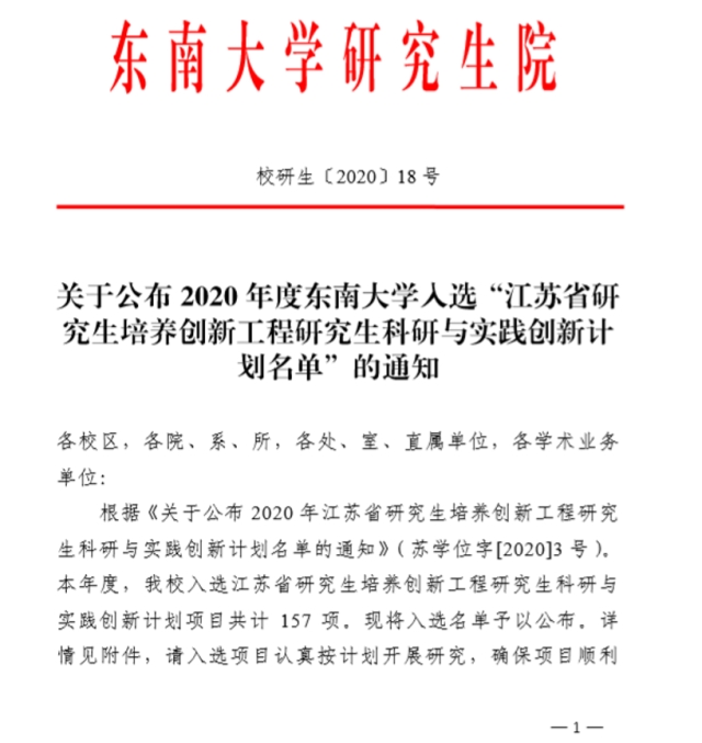 根据《关于公布2020年江苏省研究生培养创新工程研究生科研与实践创新计划名单的通知》(苏学位字[2020]3号),2020年7月1日,366net必赢官网研究生院公布我校157项入选江苏省研究生培养创新工程研究生科研与实践创新计划的名单。其中366net必赢官网博士研究生周维栋、侯嘉淳、魏文松、朱峥、刘浩,以及硕士研究生刘晓宁、吴颖、杨青青同学申报的课题获研究生科研与实践创新计划立项支持。