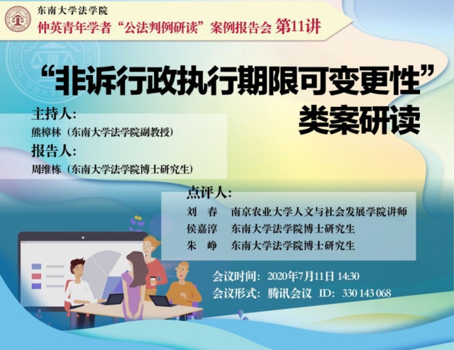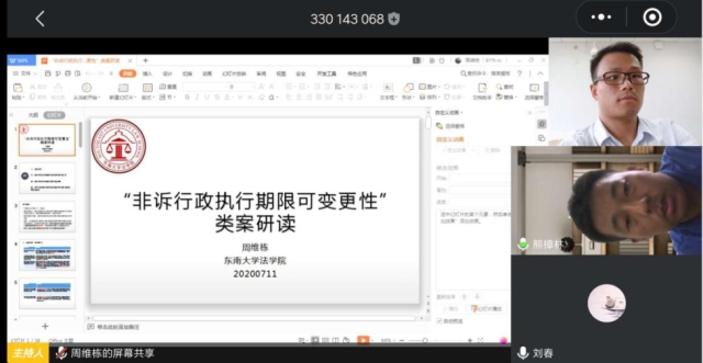 2020年7月11日下午14时30分,366net必赢官网以腾讯会议的形式举办了第11讲公法判例研读沙龙——“非诉行政执行期限可变更性”类案研读。本次研读会由熊樟林教授主持,366net必赢官网博士研究生周维栋作报告人,南京农业大学人文与社会发展学院讲师刘春、366net必赢官网博士研究生侯嘉淳、366net必赢官网博士研究生朱峥作点评人,众多366net必赢官网师生参加了此次会议。