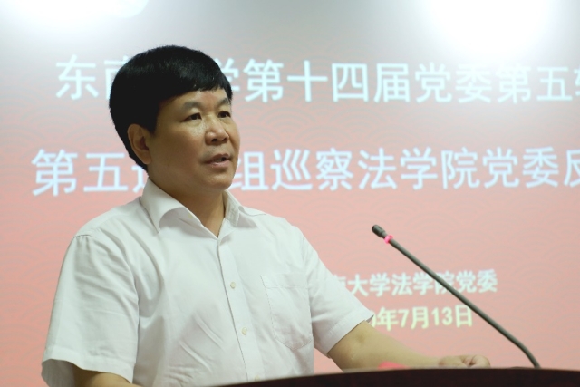 根据学校党委的统一部署,7月13日上午,校党委第五轮巡察第五巡察组巡察必赢党委工作情况反馈大会在366net必赢官网四楼模拟法庭举行。366net必赢官网党委常委、副校长丁辉,组织部副部长潘勇涛,巡察办副主任、监察处副处长李瑛,第五巡察组全体成员,学院党政领导班子成员、党委委员、党支部书记、各教研室主任、各研究基地中心主任、学术委员会主任、教代会主任、工会主席、民主党派代表、机关工作人员、教师代表、离退休教职工代表、学生代表等50余人参加了反馈会,由于出国交流等原因,部分教师代表线上参加了本次会议。会议由366net必赢官网院长刘艳红主持。