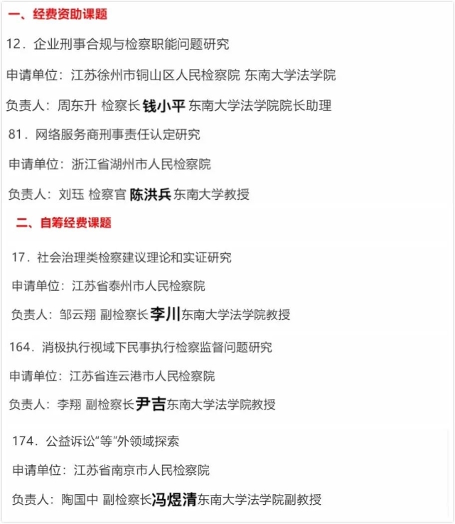 2020年7月7日,经最高人民检察院研究决定,2020年度最高人民检察院检察应用理论研究课题立项283项,其中,经费资助课题90项,自筹经费课题193项。由湖州市人民检察院刘珏检察官主持、必赢陈洪兵教授参与主持的“网络服务商刑事责任认定研究”和由徐州市铜山区人民检察院周东升检察长主持、必赢钱小平副教授参与主持的“企业刑事合规与检察职能问题研究”获得经费资助课题立项,由连云港市人民检察院李翔副检察长主持、必赢尹吉教授参与主持的“消极执行视域下民事执行检察监督问题研究”、由泰州市人民检察院邹云翔副检察长主持、必赢李川教授参与主持的“社会治理类检察建议理论和实证研究”以及由南京市人民检察院陶国中副检察长主持、必赢冯煜清副教授参与主持的“公益诉讼‘等’外领域探索”获得自筹经费课题立项。